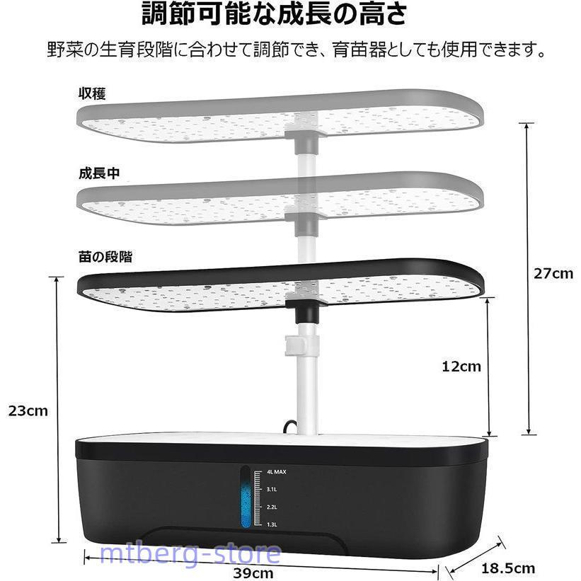 商品情報 【自動タイミングとサイレント水耕栽培】当社のインテリジェントな水耕栽培システムには、3 つの調整モードがあり、モード A: 毎日12時間ON、12時間OFF。(葉物野菜に合う); モード B : 毎日14時間ON、10時間OFF。(根菜に合う)モード C : 毎日 16 時間ON、8時間OFF。(果菜類に適しています)。サイレントウォーターポンプは5分間作動し、25分間停止します.植栽に適したモードを選択し、スイッチを短く押してモードを調整すると、自動的に循環します。初心者でも簡単に野菜を育てることができます。 【6株野菜栽培可能/調節可能な成長の高さ】水耕栽培キットには6の植栽穴があり、より多くの野菜を育てることができます; 水耕栽培キットのランプシェードの高さは12から27cmまで調整できます.野菜のさまざまな成長段階に合わせて調整できます。野菜栽培セットは、苗木キットとしても最適です。植物が発芽したら、苗木を屋外の庭に移植して栽培することができます。 【大容量可視化水槽】水耕栽培キットには独立した4Lの水槽があり、2~3週間の植物の成長をサポートできます; |