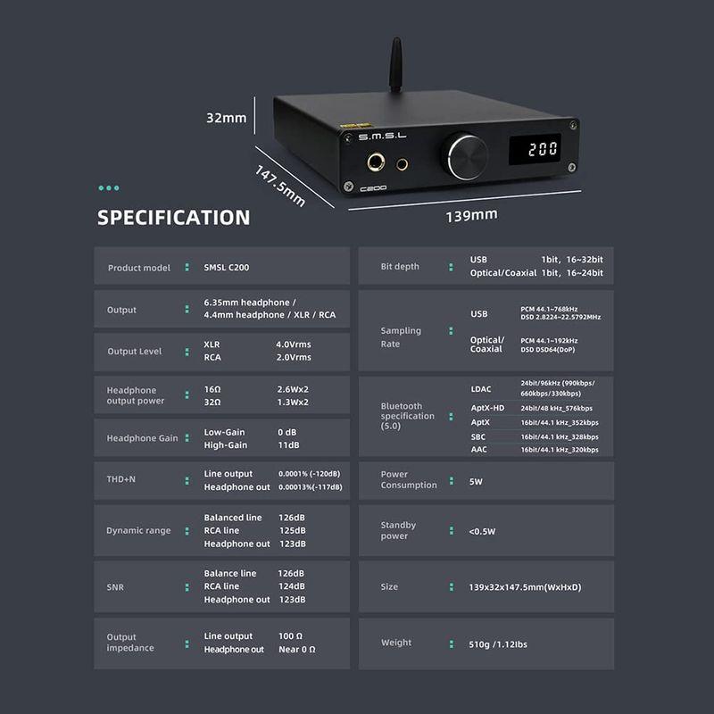 SMSL C200 USB Bluetooth DAC ヘッドフォンアンプ LDAC ハイレゾワイヤレス XMOS ES9038Q2M 4x